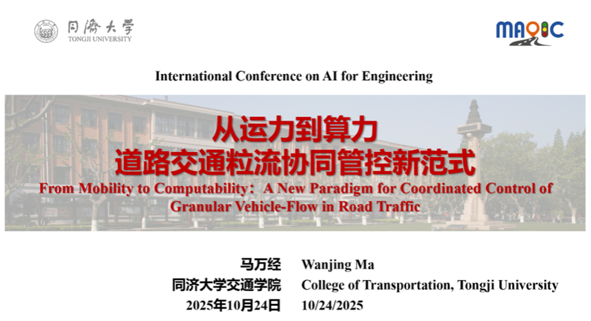 2025世界顶尖科学家论坛开幕式暨2025世界顶尖科学家协会奖颁奖典礼,于10月25日在上海临港世界顶尖科学家论坛永久会场(临港中心)举行。作为2025世界顶尖科学家论坛的分论坛之一,由上海临港科技创新发展基金会、同济大学联合主办的世界顶尖科学家论坛智能科学大会(以下简称“智能科学大会”),也于同日在上海临港中心举行。大会以“工程智能:面向未来工业体系的智能变革”为主题,集结多位图灵奖、菲尔兹奖、沃尔夫奖得主及全球顶尖学者,共话人工智能如何重塑工业体系,推动工程智能从技术突破迈向产业变革,为未来工业发展勾勒智能新图景。 课题组马万经教授受邀出席大会并作主题报告,题为《从运力到算力:道路交通粒流协同管控新范式》。